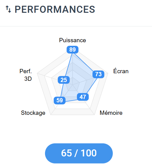 Les sous-indices aident à comprendre cette lecture. Puissance : 89/100 confirme une base processeur très convaincante pour un usage quotidien exigeant. Écran : 73/100 traduit un vrai point fort de confort, cohérent avec la dalle OLED haute définition. Mémoire : 47/100 peut surprendre au vu des 32 Go, mais rappelle qu’une bonne quantité de RAM ne suffit pas toujours à transformer la machine en référence absolue face à des modèles plus massifs ou plus orientés performance. Stockage : 59/100 reste sain et confortable avec 1 To, sans être exceptionnel dans cette gamme de prix. Enfin, Performance 3D : 25/100 alerte clairement : ce portable n’est pas à acheter pour des usages graphiques lourds ou pour jouer sérieusement.